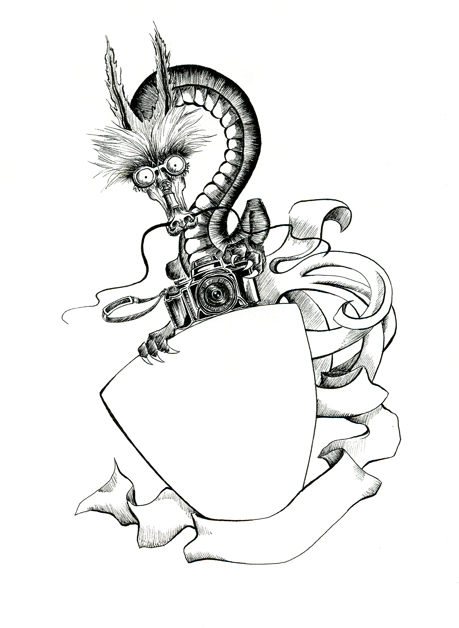 This photographer wanted an hand-drawn inked illustration for the back of his printed photos that included dragons and cameras.
