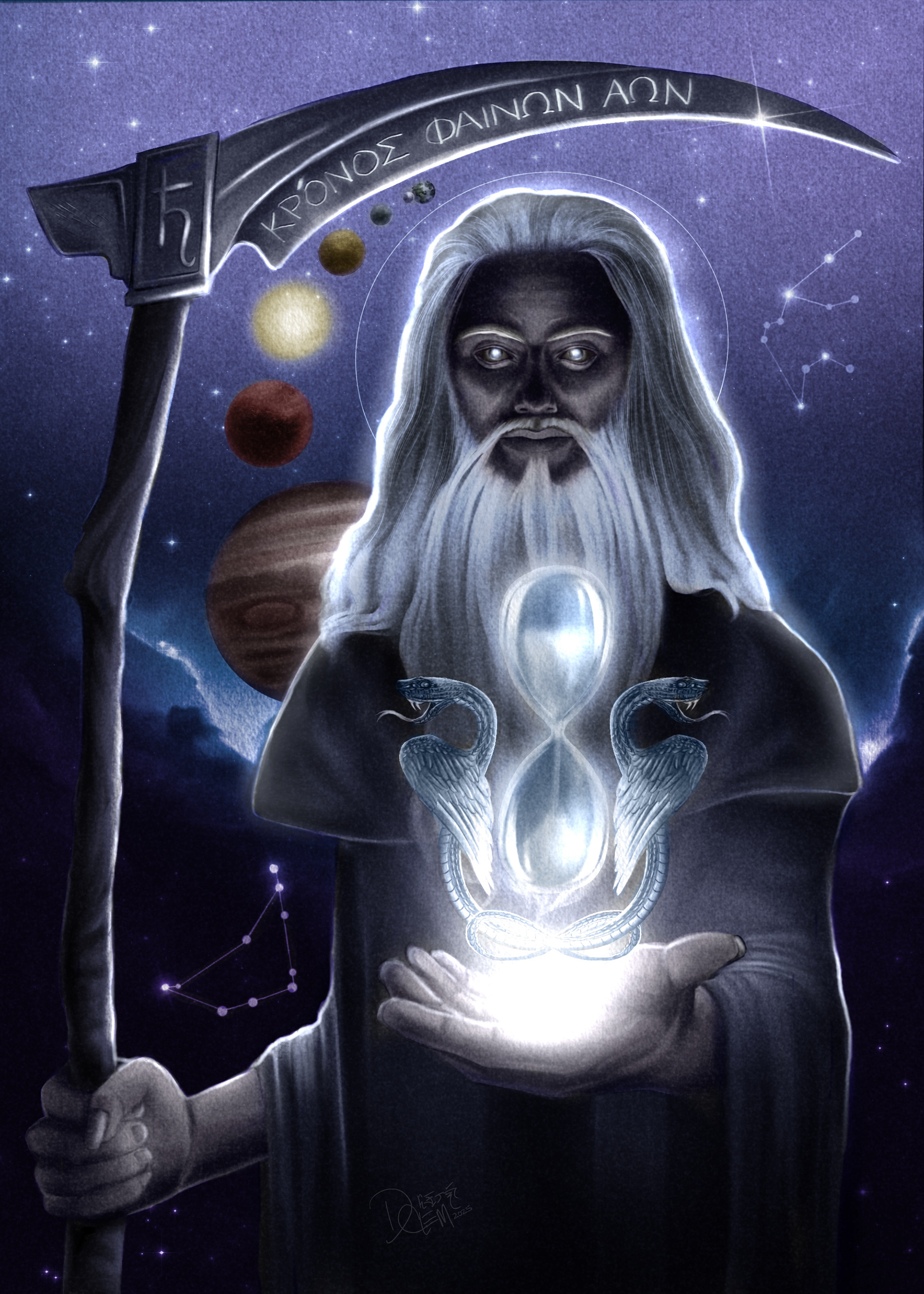 Elements of note: This archon's domain is of time, death, structure and karma. He is holding a scythe with the symbol of Saturn, and his secret names are inscribed on the blade in ancient Greek. Behind him are the other planets/archons in Hellenistic tradition, in the order that the soul goes through before materializing on Gaia. The constellations of the signs he traditionally rules are also in the background (Capricorn and Aquarius). Saturn is the first archon the soul meets to determine the nature and duration of their life path, and when that time is up, the last archon they would meet before returning to their starry source...or trying again.